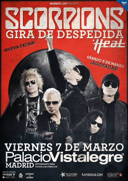 Todo estaba planeado para que nos pudiéramos despedir de los Scorpions el 8 de Marzo de 2014 pero las entradas se agotaron tan rápido y la demanda ha sido tan elevada que se ha programado un segunda fecha quserá el 7 de marzo también en el Palacio de Vistalegre en el que irán acompañados para calentar el ambiente por los suecos H.E.A.T. (Recordad que el día 8 son Steel Panther los teloneros)